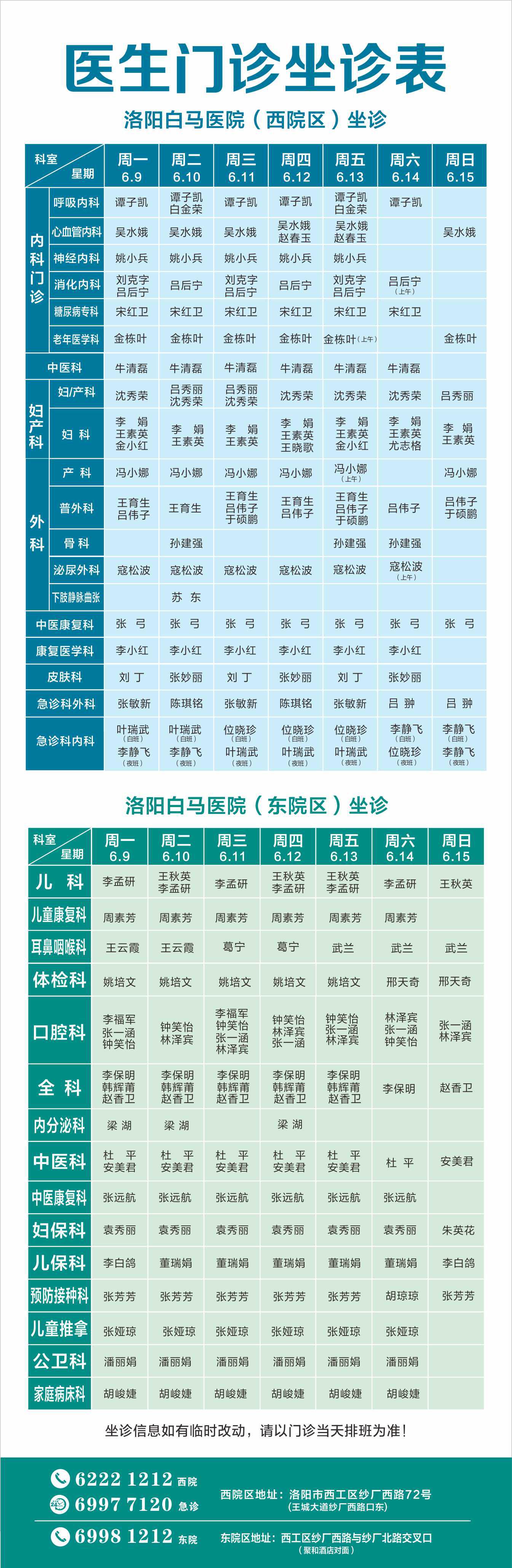 【6.9-6.15】洛阳白马医院医生门诊排班表