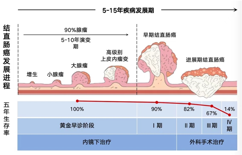 结肠息肉与早期大肠癌常无自觉症状,多通过筛查得以发现。如果出现突然的排便习惯改变、腹痛、腹泻或便血等情况,请务必及时进行肠镜检查。肠道肿瘤发现越早,治疗效果及预后越好。